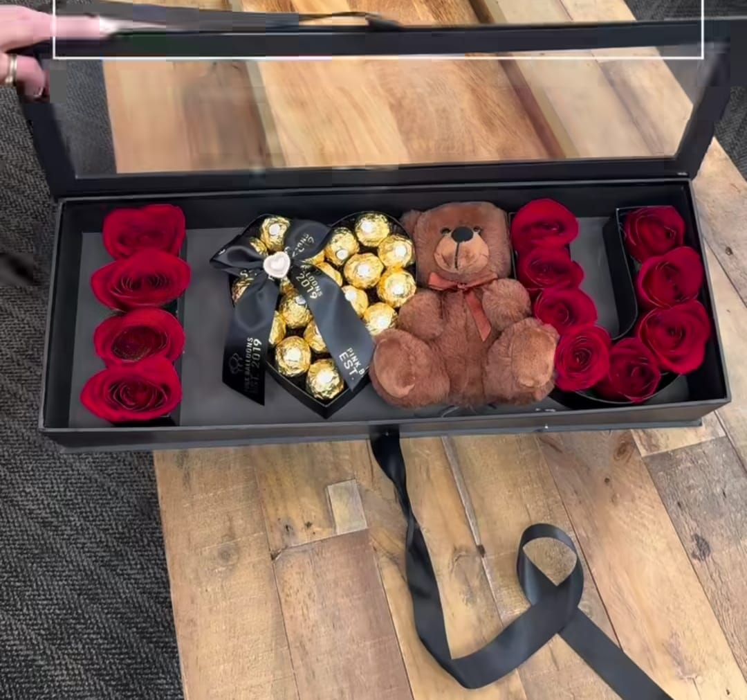 Caja con tapa ventana en acetato adornada con rosas bombones de chocolates y osito de peluche
